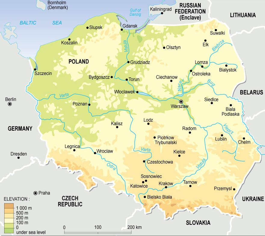 Carte de la Pologne topographiques. Pologne carte topographique (Europe de l'est - Europe) à imprimer. Pologne carte topographique (Europe de l'est - Europe) à télécharger. Le pays s'étend sur 876 kilomètres du nord au sud et sur 689 kilomètres d'est en ouest, pour une superficie de 564 5897 kilomètres carrés, y compris les eaux intérieures. L'altitude moyenne est de 173 mètres, et seulement 3% du territoire polonais, le long de la frontière sud, est plus élevé que 500 mètres comme le montre la carte topographique de la Pologne. L'altitude la plus élevée est le Mont Rysy, qui s'élève à 2 499 mètres dans la chaîne des Tatras des Carpates, à 95 kilomètres au sud de Cracovie. Environ 60 kilomètres carrés le long du golfe de Gdańsk se trouvent sous le niveau de la mer. La Pologne est traditionnellement divisée en cinq zones topographiques du nord au sud.